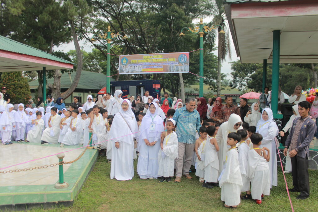 Sebanyak 880 siswa PAUD dari 25 TK/KB di Kecamatan Payakumbuh Timur berkumpul, didampingi oleh 100 guru pendamping. Bimbingan penuh kesabaran dari para guru membuat anak-anak berani melangkah, meski beberapa masih ragu-ragu. Dengan tertib mereka berjalan melingkari replika Ka’bah, menirukan thawaf, melafalkan doa-doa, hingga melaksanakan sai dengan langkah kecil yang penuh semangat.